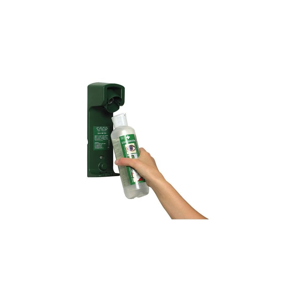 The wall bracket for the 500ml Cederroth eyewash opens the bottle automatically when the bottle is rotated and released from the eyewash stand.