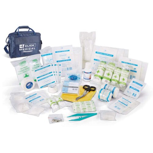 Alcohol Free Cleansing Wipes x 10. Wound Wash Spray 70ml x 1. Fabric Dressing Strip 60mm x 1m x 1. Cotton Wool Roll 15gm x 1. Crepe Bandage 5cm x 4.5m x 1. Crepe Bandage 7.5cm s 4.5m x 1. Crepe Bandage 10cm x 4.5m x1. Crepe Bandage 15cm x 4.5m x 1. Conforming Bandage 7.5cm x 4.5m x 2. Eyewash Bottle 500ml x 1. Eyewash Pods 20ml x 5. Foil Blanket x 2. Blister Plasters x 4. Hand Gel 50ml x 1. Petroleum Jelly x 1. Plasters Wash proof x 20. Plasters Fabric x 20. Resuscitation Face Shield x 1. Scissors -TuffCut x 1. Self-Seal Waste Bags x 2. Sport Instant Ice Pack x 2. Freeze Spray 150ml x 1. Resusciade x 1. Spray Bottle 250ml x 1. Sterile Dressing Medium x 3. Sterile Dressing Large x 3. Sterile Eye Pad x 2. Sterile X large Dressing x 2. Sterile Low adherent Dressing 5 x 5cm x 3. Sterile Low adherent Dressing 10 x 10cm x 2. Sterile Low Adherent Adhesive Dressing 8 x 6cm x 3. Sterile Low Adherent Adhesive Dressing 10 x 8cm x 3. Sterile Skin Closure Strip 3mm x 75, pack of 3, 5 strips to a sheet x 1(15 strips). Triangular Bandage x 4. Safety 8pins x 6. Vinyl Gloves x 8. Zinc Oxide Tape 2.5cm x 5m x 1. Zinc Oxide Tape 1.25cm x 5m x 1. Zinc Oxide Tape 5.0cm x 5m x 1. Microporous Tape 2.5cm x 5m x 1. Guidance leaflet x 1. Touchline Bag (Large) x 1. Heamostatic Plasters (pk 10) x 1. Cut-Eeze Soluable Dressing 5 x 5cm x 1.