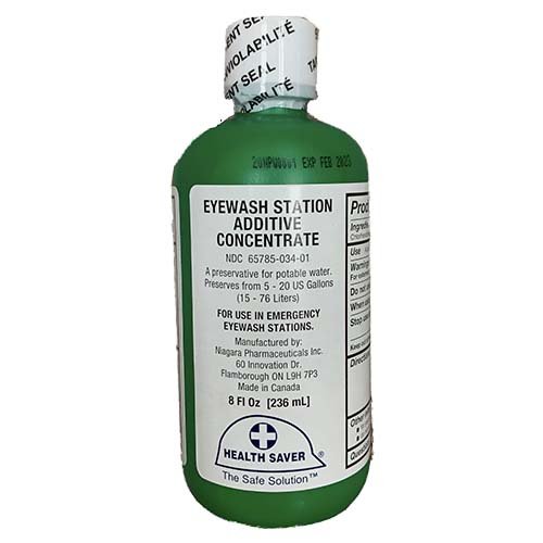 An 8 Fl oz (236ml) bottle of water preservative for use with the portable self-contained eye/face wash stations