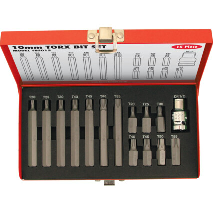 This 15 piece screwdriver bit set contains 15 TX 1/2in. hex drive bits, manufactured from high alloy chrome molybdenum steel. The bits are supplied in a metal case for safekeeping and are suited for use on both hand and power tools.