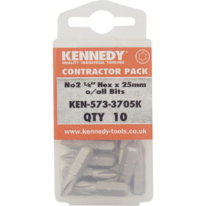 Thie 10 piece set contains flat and crosspoint screwdriver bits as well as a quick release 1/4in. square drive hexagon bit adaptor to ensure you have the right bit to hand no matter the application. All kennedy® screwdriver bits have a hardness of 58 – 62HRC and are manufactured from high alloy chrome molybdenum steel.