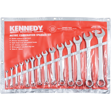 Kennedy Combination Spanners are durable and versatile tools designed for a range of applications. This 14-piece metric set, made from robust chrome vanadium steel, features a satin finish to resist dirt and polished heads for smooth operation. The 15° open jaw angle enhances torque and usability, while the ring end offset improves flexibility.