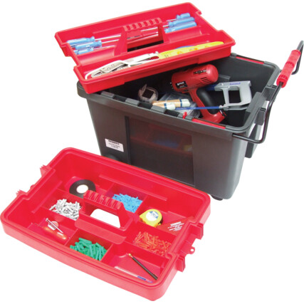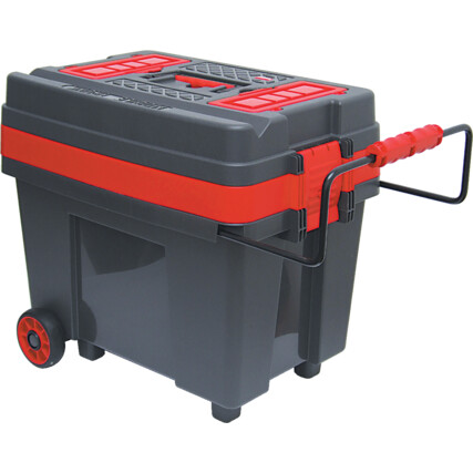 This sturdy mobile toolbox is made from impact resistant plastic with a large lower storage area for power tools. The product possesses an integral tow handle that slides out for ease of transport and stows away when not in use. The two internal nested tote trays help separate smaller tools and aid easy access to your most commonly used items. The lockable lid has two inset lidded storage compartments for small parts and or fixings.
