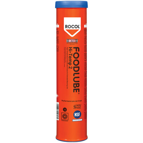 ROCOL FOODLUBE Hi-Temp Grease 2 is a silicone grease fortified with PTFE, suitable for high temperature applications. Designed for the lubrication of all types of slower bearings and sliding surfaces. Ideal for rubbers and plastics.
