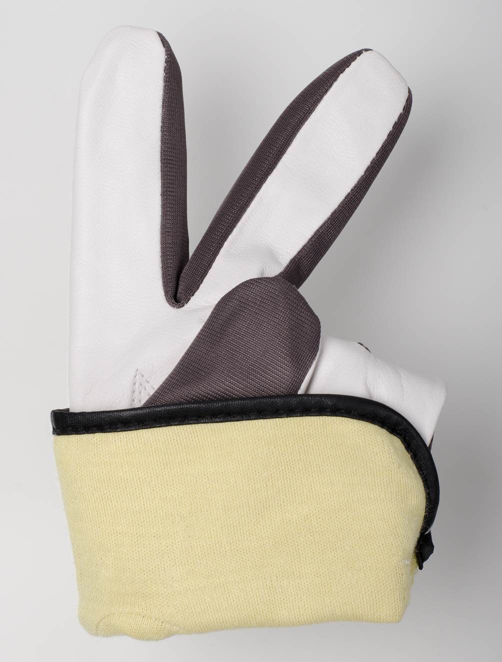 Cut resistant glove, Fully lined, 0,6-0,7 mm, Full grain goatskin of top quality, KEVLAR® fiber, Cat. II, Grey, white, Reinforced index finger, Reinforced fingertips, Elasticated 180°, for precision work.