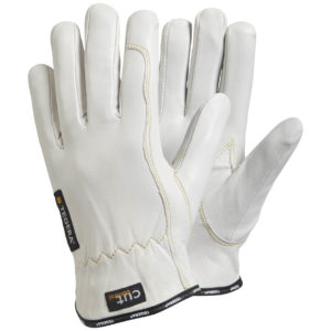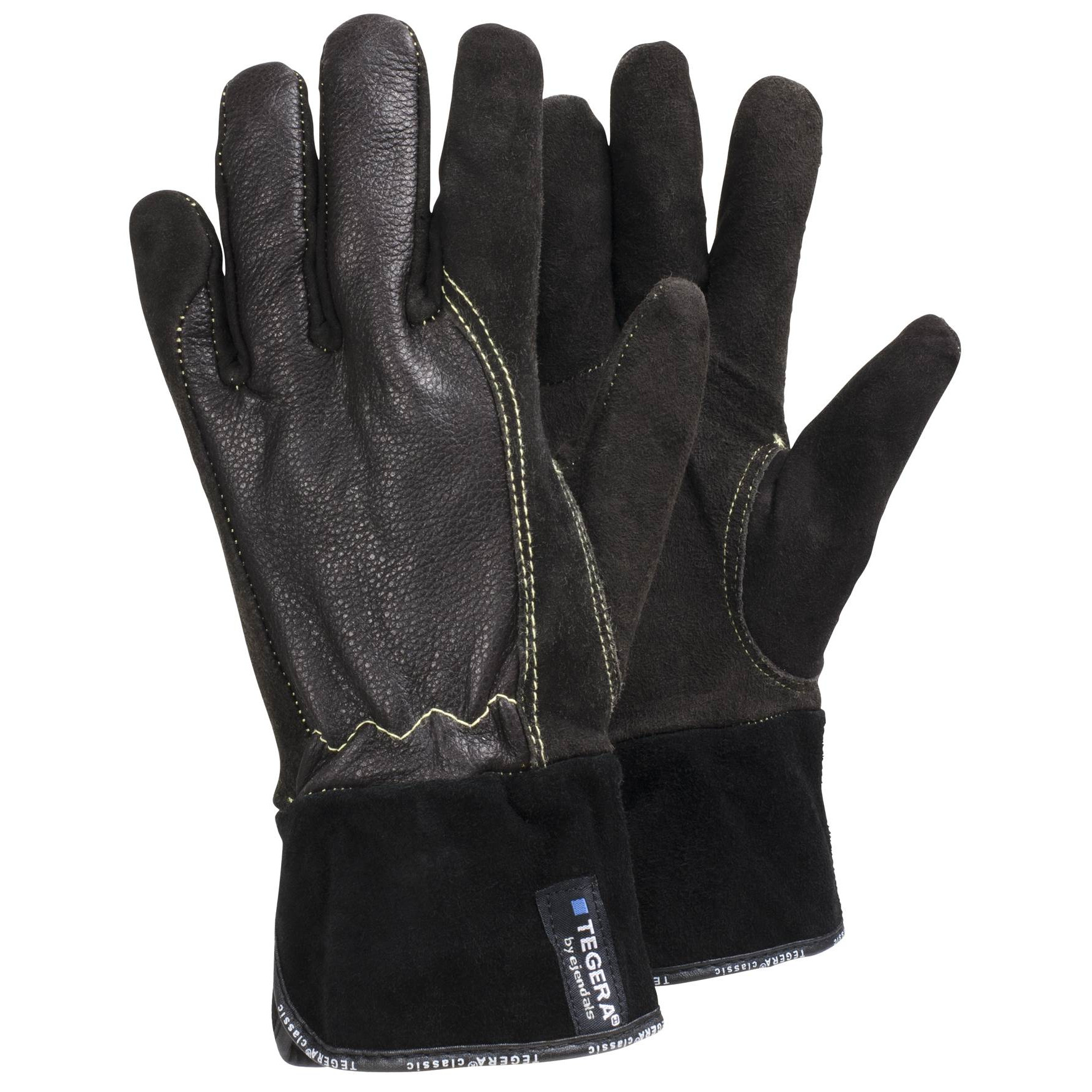 Flame retardant, withstands welding sparks and grinding splash, reinforced thumb, reinforced index finger, reinforced seams, withstands contact heat up to 100°c, water and oil repellent;
