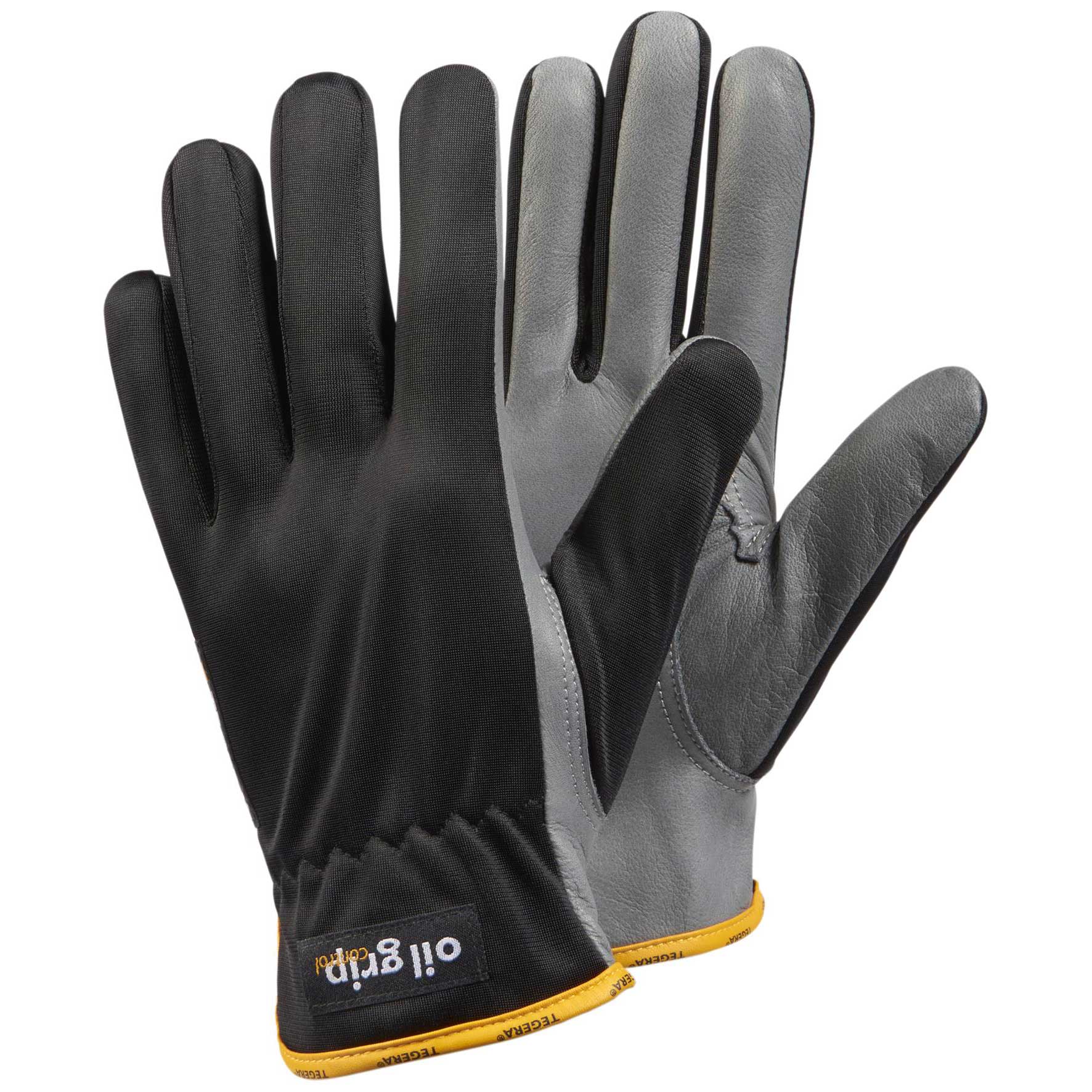 Leather glove, 0,7-0,8 mm, Full grain cowhide, Polyester, Cat. II, Grey, black, Water and oil repellent palm, Withstands contact heat up to 100°C, Elasticated 180°, for fine assembly work